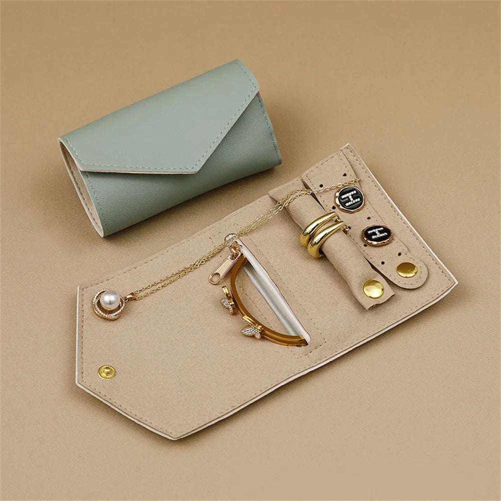 Cette petite pochette à bijoux offre une organisation astucieuse pour bagues, colliers, bracelets et boucles d'oreilles. Grâce à ses compartiments pratiques et à sa fermeture à bouton-pression sécurisée, vos bijoux restent bien rangés et protégés des rayures ou des emmêlements – parfaite pour les voyages ou le rangement élégant à la maison.