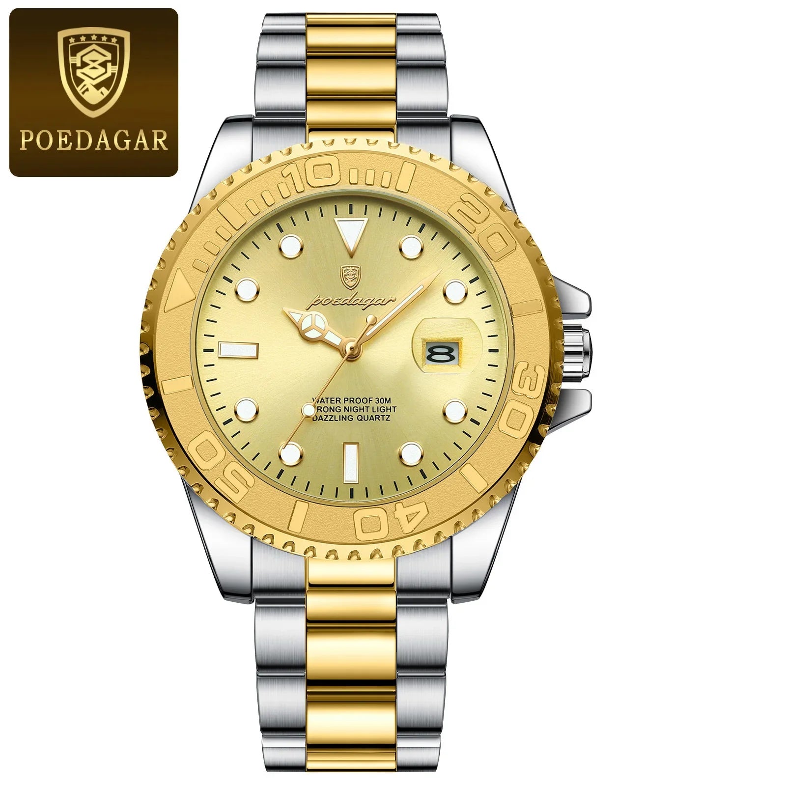 La montre pour homme POEDAGAR se présente dans un design sportif et combine un chronométrage précis avec un look saisissant. Le modèle est équipé d'un mouvement à quartz, d'un boîtier rond en acier inoxydable et d'un bracelet en acier inoxydable. Les fonctions comprennent la fonction lumineuse, l'affichage de la date, l'étanchéité et les aiguilles lumineuses. L'affichage est sans chiffres. Le verre de la montre est en Hardlex.